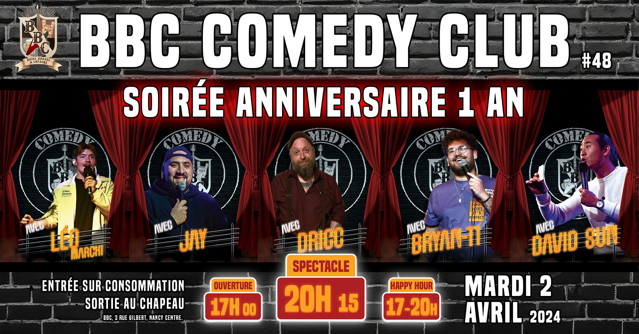 ?? Ce mardi 2 avril, c'est la soirée tant attendue pour célébrer le premier anniversaire du BBC Comedy Club lors de cette édition #48 ! ?