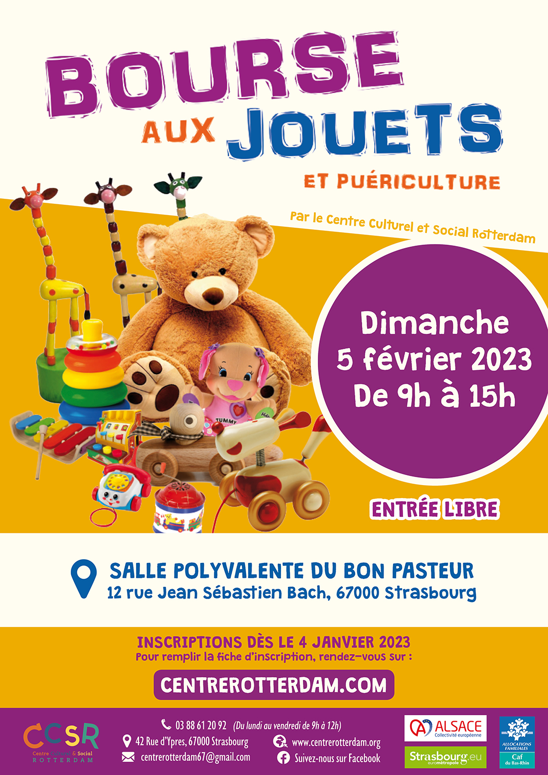 Après le succès de la Bourse aux Jouets et Puériculture des années précédentes, le Centre Culturel et Social Rotterdam réitère cette manifestation le dimanche 5 février 2023, de 9h à 15h. L’événement se déroulera à la Salle Polyvalente du Bon Pasteur, 12 Bd Jean Sébastien Bach, à Strasbourg.