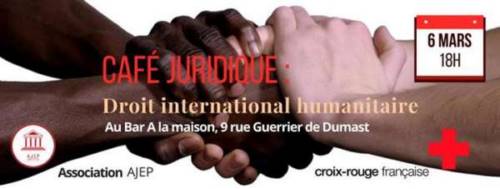 Entre témoignages et réflexions juridiques internationales, l’AJEP en collaboration avec la CROIX ROUGE te propose, ce mercredi 6 mars à 18H un café juridique sur le thème du DROIT INTERNATIONAL HUMANITAIRE et sa pertinence dans le contexte international actuel.