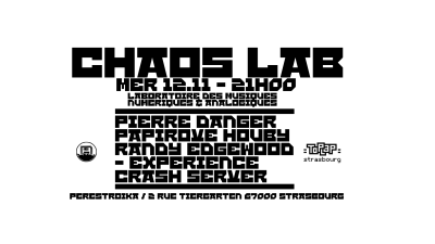 Plongez dans l’univers atypique de Chaos Lab, une série d’événements conçus pour explorer la frontière entre le bruit, le code, l’immersion audio-visuelle et la rupture. À chaque édition, nous privilégions les expériences live exclusives, l’art du livecoding, la collision entre sons organiques et machines numériques, et une voix libre pour chaque création. Préparez-vous à être emporté·e dans un voyage inattendu où chaos rime avec création. Projection video à tous les concerts, performances live sans compris.