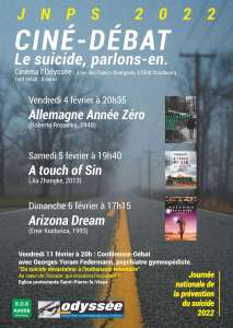 Allemagne Année Zéro (1948), de Roberto Rossellini, est le premier des trois films projetés dans le cadre du mini festival de la Journée Nationale de la prévention du suicide - JNPS 2022, à l'initiative de SOS Amitié Strasbourg. Un film poignant par un réalisateur magnifique, qui parle du suicide d'un jeune garçon, dans la débâcle de l'Allemagne, juste après la défaite nazie. Le club Ciné-Psy donnera son éclairage lors du débat qui suivra la projection. Comprendre, prévenir le fléau du suicide qui provoque la mort de 9000 personnes par an en France.