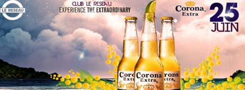 La CORONA, la bière mexicaine créée en 1925 par Pablo Diez, rafraîchissante, aux arômes de téquila, de citron et de malt, vous attend au Réseau! On sort les parasols et les transats, l’hôtesse Corona enflammera le bar de son déhanché et distribuera des t-shirts et des goodies!