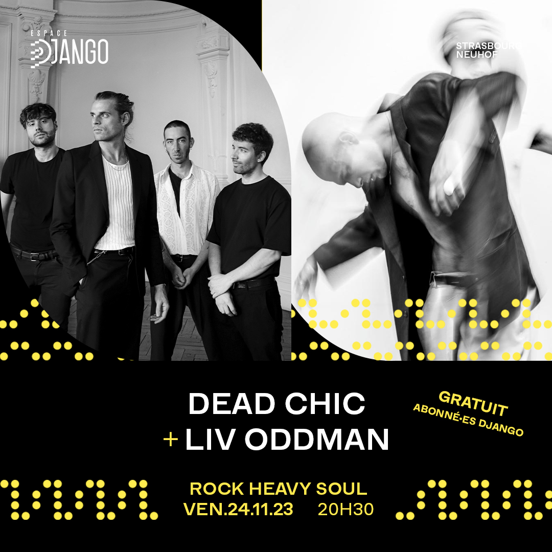 L’interprétation est l’art de traduire un propos avec virtuosité, de transmettre ou révéler le sens d’une œuvre artistique. Vous verrez qu’avec DEAD CHIC et Liv Oddman, ces enjeux prennent vie. Une rencontre franco-britannique fait éclore DEAD CHIC, une sorte de all stars ou chaque musicien excelle dans un tourbillon insaisissable. Une voix rocailleuse et familière, une rythmique au cordeau, l’alchimie est parfaite. Concernant Liv Oddman, les qualificatifs ne manquent pas et sont foncièrement les mêmes. Si vous pensiez avoir tout vu en terme d’interprétation, découvrez cet ovni, crooner, chanteur, performer qui oscille entre chanson, rock, punk et autres influences d’origines contrôlées. Une soirée électrisante, fougueuse, irrésistible !