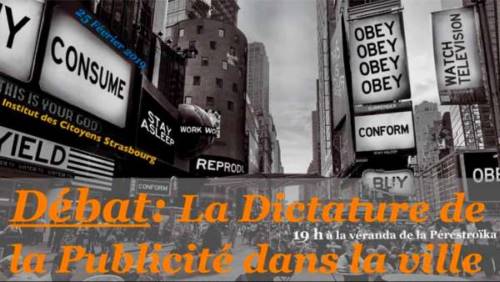 Pour cette grande discussion nous avons invité Résistance à l’Agression Publicitaire - Strasbourg qui se présentera et viendra mettre en perspective l’impact des publicités de notre espace quotidien sur nos comportements et nos mentalités.