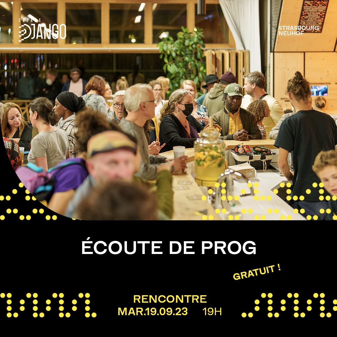 Le constat est évident : comment savoir de quoi on parle si on n’écoute pas ? L’Espace Django vous propose sa traditionnelle “écoute de prog”, un moment convivial pour prendre le temps d’écouter les artistes de la programmation à venir à Django. Des explications du programmateur sur ses choix, ses dilemmes et ses coups de cœur, le regard d’une équipe sur un projet global au plus proche des habitant·es, la complicité de la programmation et de l’action culturelle, la mise en lumière de la scène locale… Tant de sujets que l’équipe se fera un plaisir d’exposer à vos oreilles curieuses.