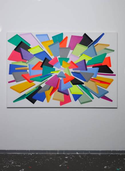 Au modèle artisanal, les outils et les gestes sont, eux aussi, toujours les mêmes. En découle la délimitation des formes qui est stricte et sans retour. Même brisées ou cassées, elles sont toutes rigoureusement calculées. Il n’y a pas de place au hasard ou à l’erreur. Tout est pensé en amont. L’expérimentation n’est pas permise, la surproduction encore moins. Cette volonté d’optimiser l’acte de peindre me guide, structure et construit le travail aussi bien lors de mes recherches préliminaires qu’au cours de la réalisation de la toile. Concernant les couleurs qui ne peuvent être maîtrisées par la raison, il n’est ni question d’harmonie, ni de disharmonie. Encore moins de mes goûts. Leur rayonnement dépasse les dogmes, les théories, mes avis. Contrairement aux formes, elles ont toutes les libertés. Parfois bruyantes et envahissantes, les couleurs résonnent, se répondent librement. Les laisser agir, grandir et activer le tableau.