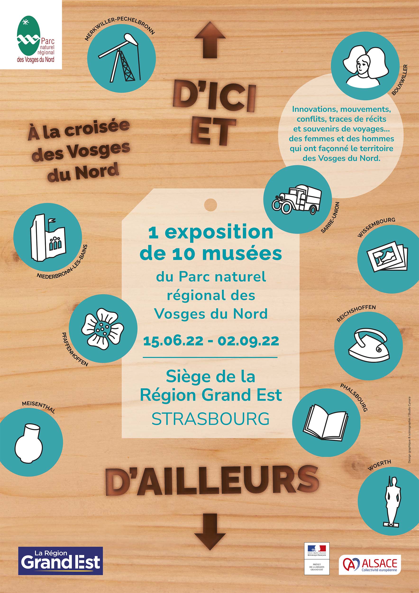 « D’ici et d’ailleurs » donne aux visiteurs l’envie de découvrir, outre le magnifique territoire des Vosges du nord, les musées et leurs collections. En itinérance depuis 2019 à travers la Région Grand Est, elle fait une halte au Siège de la Région.