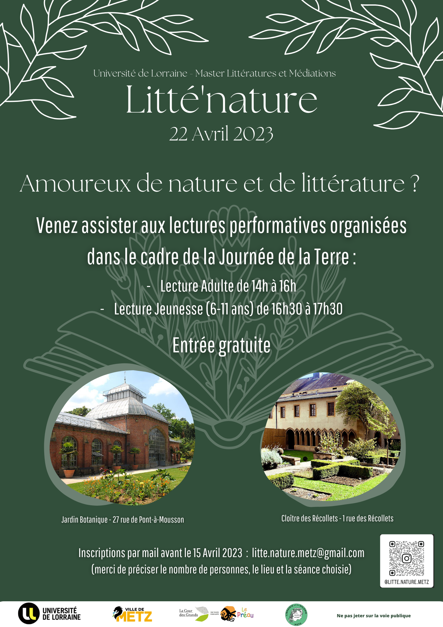 Amoureux de nature et de littérature ? Venez assister aux lectures performatives qui se tiendront le Samedi 22 Avril 2023 au Jardin botanique et au Cloitre des Récollets à l’occasion de la 53ème journée mondiale de la terre. Ce moment sera l’occasion d’aborder les thématiques écologiques et environnementales actuelles au travers de la littérature, classique ou contemporaine, et d’engager une réflexion sur la place que la nature tient aujourd’hui dans notre quotidien.
