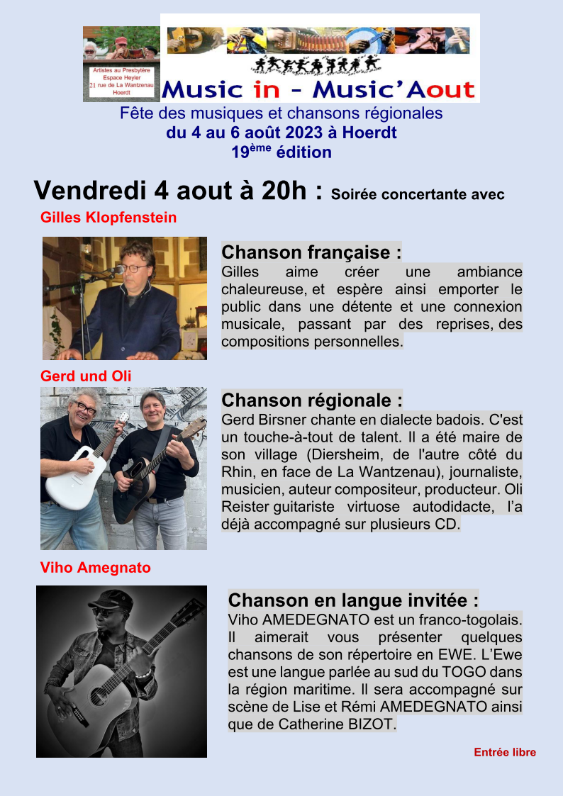 Gerd et Oli : Gerd Birsner chante en dialecte badois. C'est un touche-à tout de talent. Il a été maire de son village (Diersheim, de l'autre côté du Rhin, en face de La Wantzenau), il est journaliste, musicien, auteur compositeur, producteur… Il s’est associé à Oli Reister guitariste virtuose autodidacte, qui l’a déjà accompagné sur plusieurs CD.