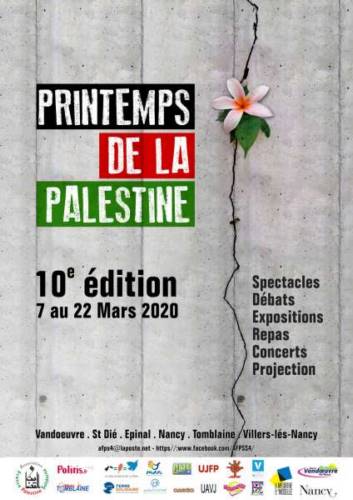 La Palestine dans tous ses états? - Samedi 7 mars 2020 de 14 h à 18 h - Place Maginot à Nancy Différents spectacles ouvriront ce 10ième festival et mélangeront les genres : rock, reggae, chants de lutte?, danse hip-hop.