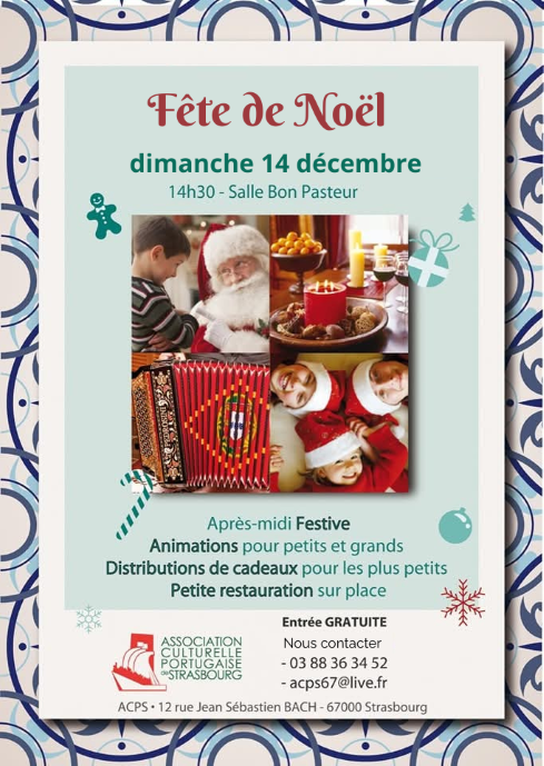 L'association culturelle portugaise de Strasbourg, organise sa fête de Noël dimanche 14 décembre à partir de 14h30 à la salle Bon Pasteur à Strasbourg, 12 boulevard Jean Sébastien Bach.