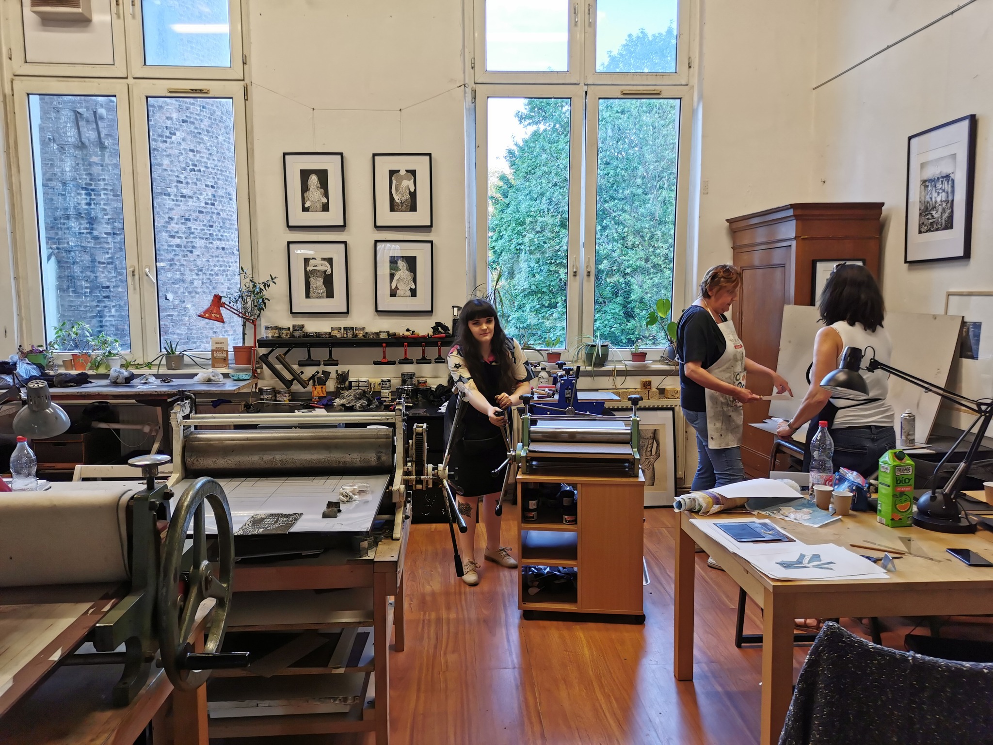 Nous travaillons avec deux presses taille-douce d’un format 150x75cm, permettant l’impression d’estampes de grand format, et une presse de format 90x40cm. Nous possédons aussi pour nos événements extérieurs une petite presse mobile. Il y a aussi une boite à grain qui permet de faire des aquatintes sur un format 50x70cm.