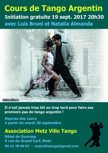 Une initiation gratuite dirigée par Luis Bruni, accompagné de Natalia Almada, permettra aux débutants de faire leurs premiers pas le mardi 19 septembre 2017 à 20h30 à l’Hôtel de Gournay, 9 rue du Grand Cerf, METZ.