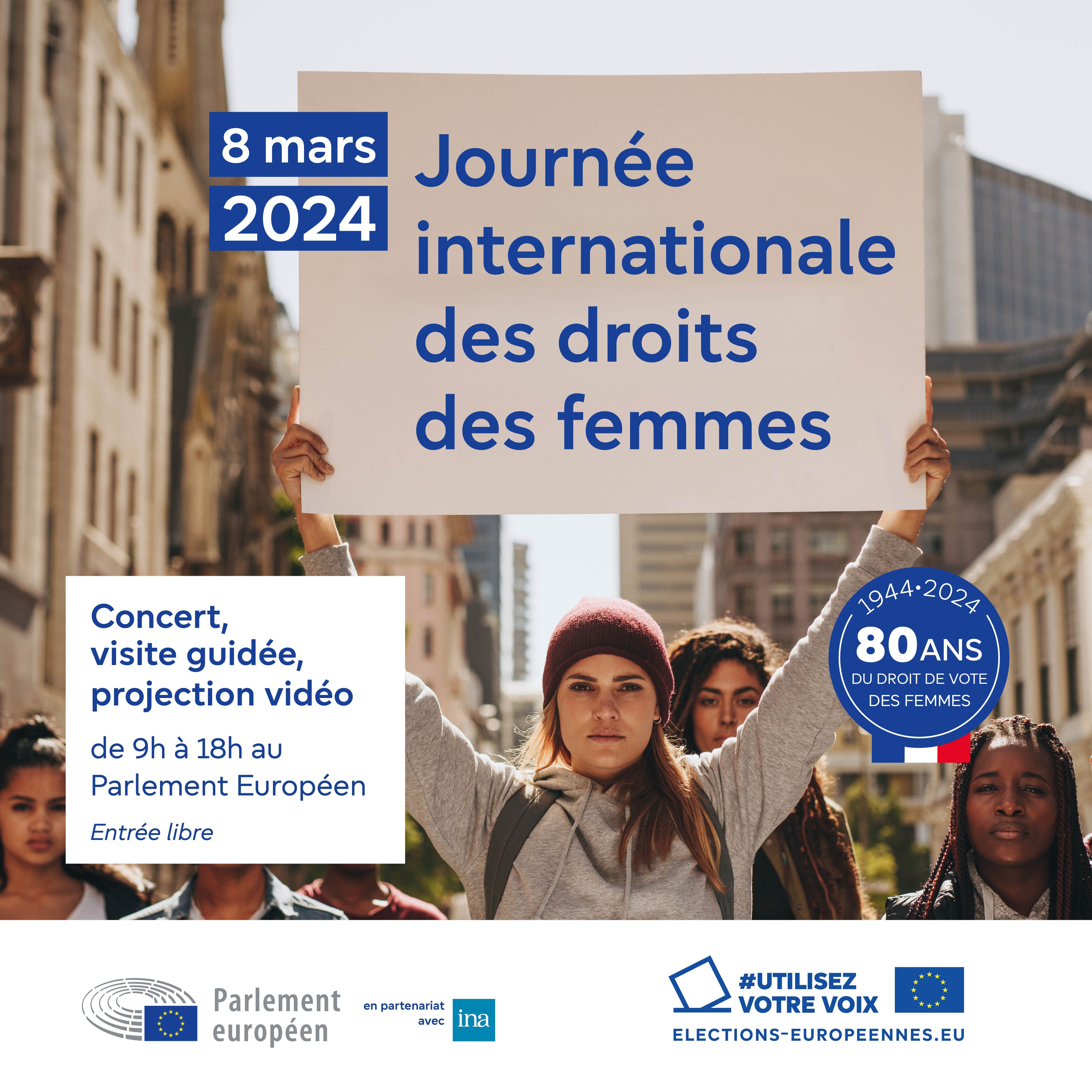 Le vendredi 8 mars 2024, à l'occasion de la Journée internationale des droits des femmes, l'Unité de liaison avec les visiteurs et les citoyens propose sur le circuit visiteurs du Parlement européen à Strasbourg, plusieurs activités pour une journée d'action, de rassemblement et de sensibilisation autour des luttes pour les droits des femmes.