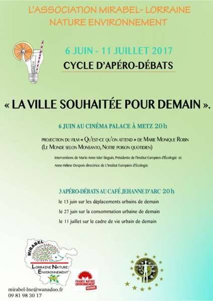 Sur quatre soirées s’écoulant du 6 juin au 11 juillet 2017, l’association Mirabel-­ Lorraine Nature Environnement vous invite à son premier cycle d’apéro-­‐débats à Metz sur le thème de « La ville souhaitée pour demain ».