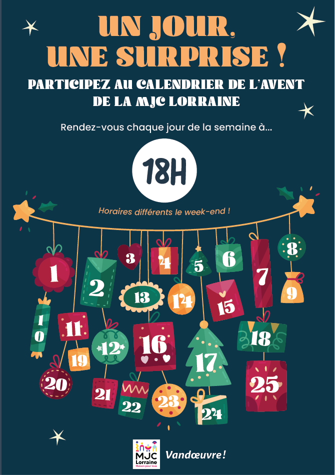 Consultez-ici le programme du calendrier de l’avent : https://drive.google.com/file/d/1NTwA6nxgjGhU3Ow01F7uTUhLGxSFxuUR/view?usp=sharing