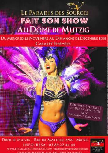 Le Cabaret Haut-Rhinois, Le Paradis des Sources va s’installer quelques jours au Dôme de Mutzig ! Dans ses valises, le cabaret à ramené sa troupe d’Artistes Internationaux, qui, pour votre plus grand plaisir, vous proposeront un incroyable spectacle.