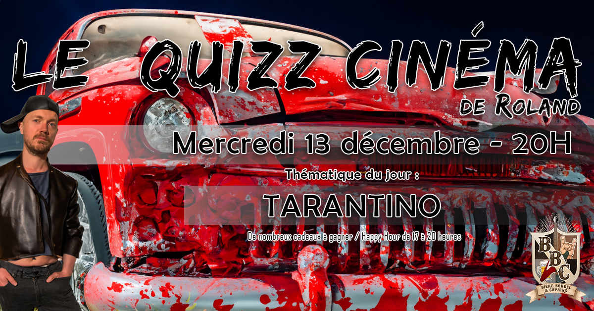 ?? Le 13 décembre, le BBC vous plonge dans l'univers effervescent de Quentin Tarantino lors d'une soirée ciné-quiz qui rend hommage au maître du cinéma. Préparez-vous à un voyage à travers les dialogues percutants, les scènes emblématiques, et les personnages inoubliables de l'un des réalisateurs les plus emblématiques de notre époque.