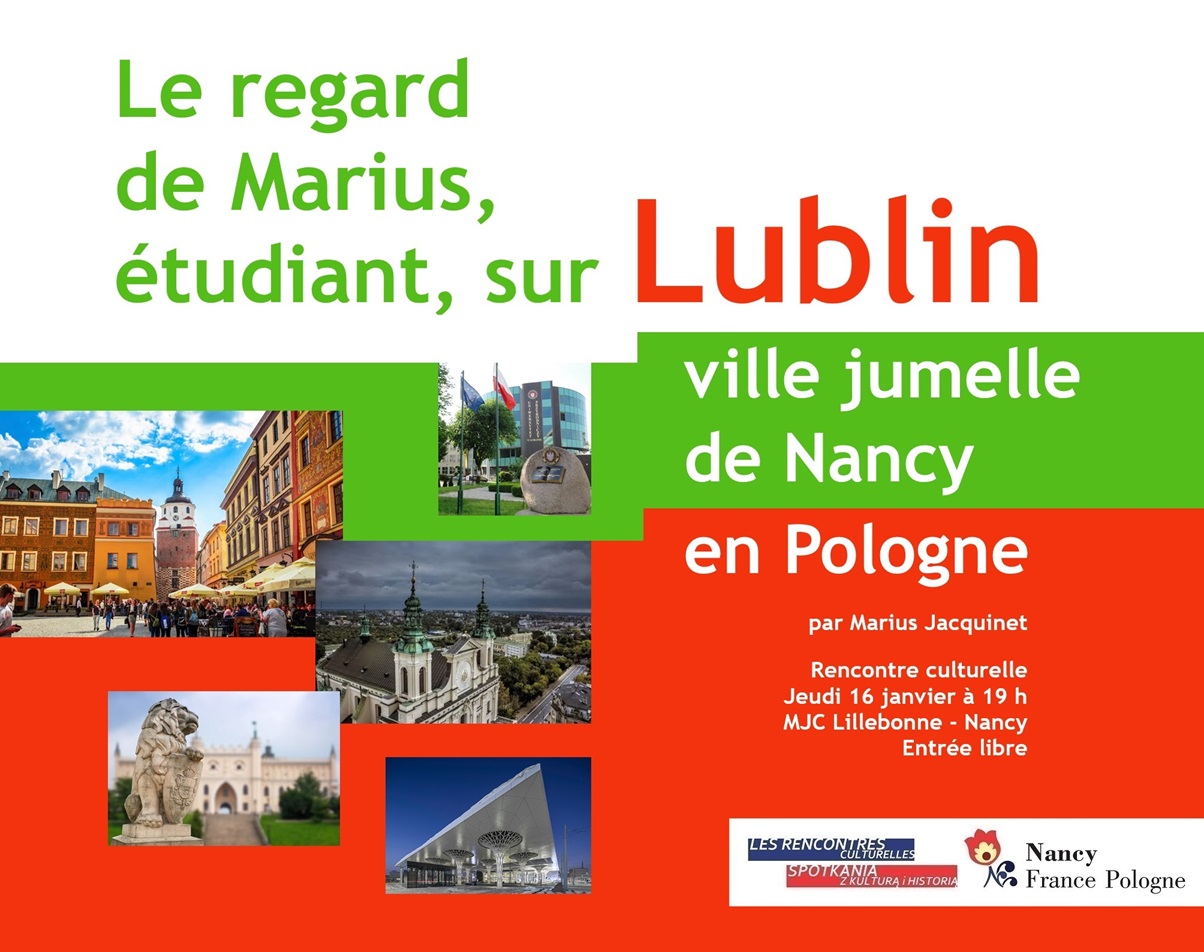 Rencontre culturelle proposée par l’association Nancy France-Pologne. Intervention de Marius Jacquinet, étudiant en LEA à l’Université de Lorraine. Pendant le mois d’août 2024, Marius a pu découvrir la ville de Lublin – située dans l’est de la Pologne – à l’occasion d’un stage. Entrée libre.