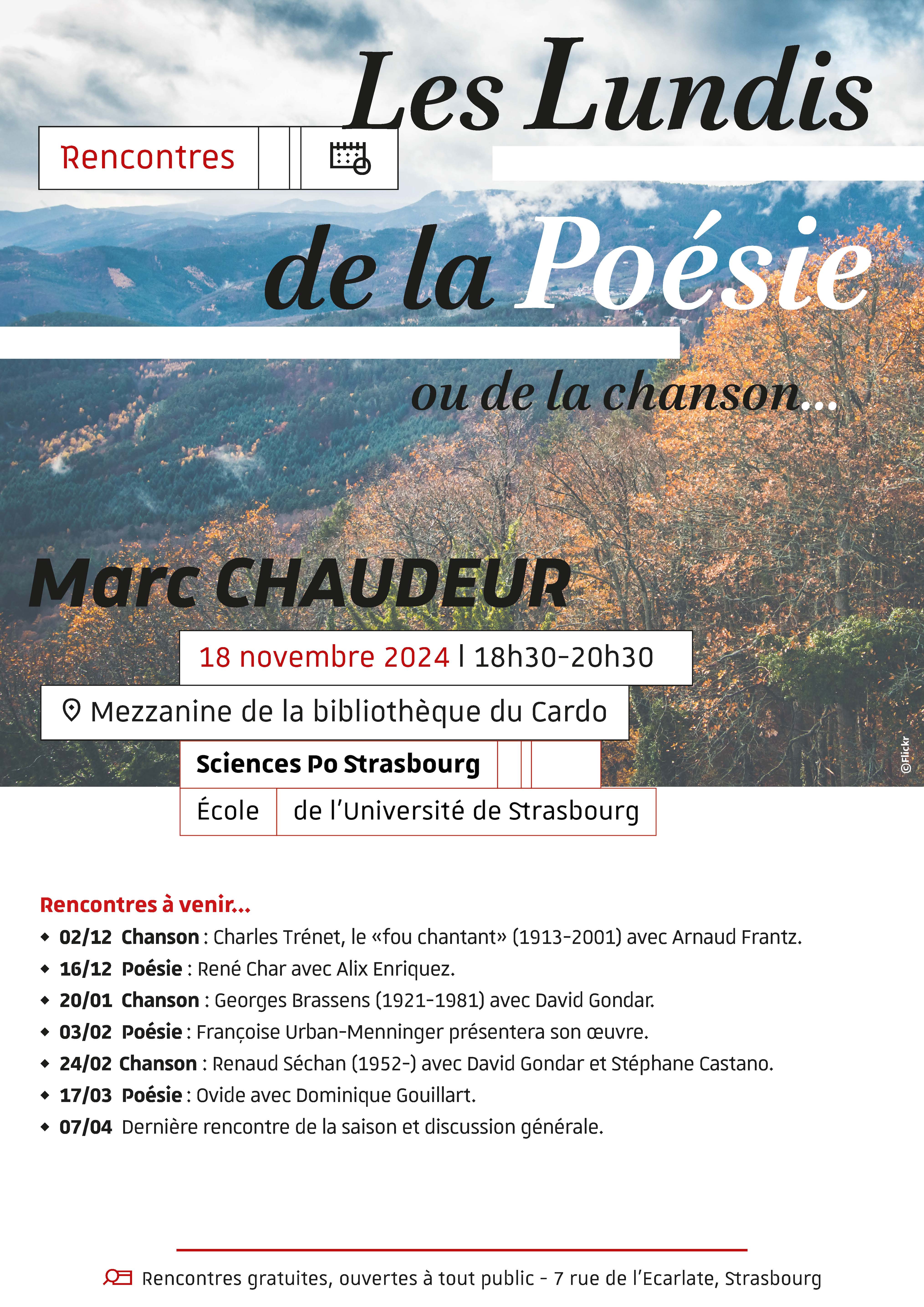 Lundi 18 novembre - Mezzanine de la bibliothèque du Cardo de 18h30 à 20h30. Cycle initié par Enrique Uribe, enseignant à Sciences Po Strasbourg et Louis Castano, étudiant et poète.