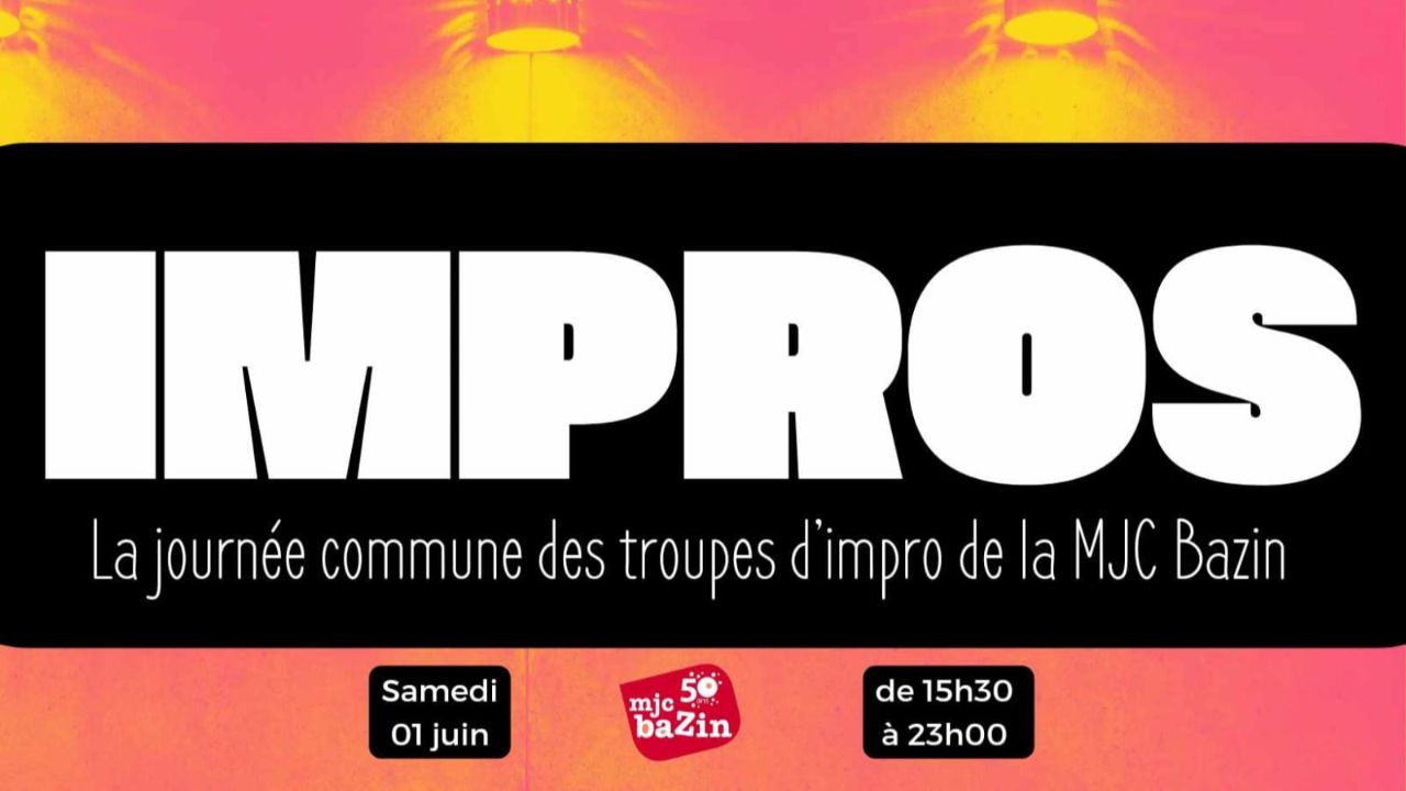 Pour bien terminer la saison, les 6 compagnies d’improvisation de la MJC Bazin vous accueillent le SAMEDI 24 MAI dès 17h30 pour 4 spectacles joués en commun. Au programme, du rire, du rythme, des jeux, de la romance… enfin bref, de l’impro !
