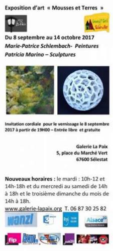 Galerie La Paix 5, place du Marché Vert 67600 Sélestat / 0368054136 / 0687302582 Sites : et http://www.galerie-lapaix.org et http://www.galeriedartlapaixselestat.over-blog.com