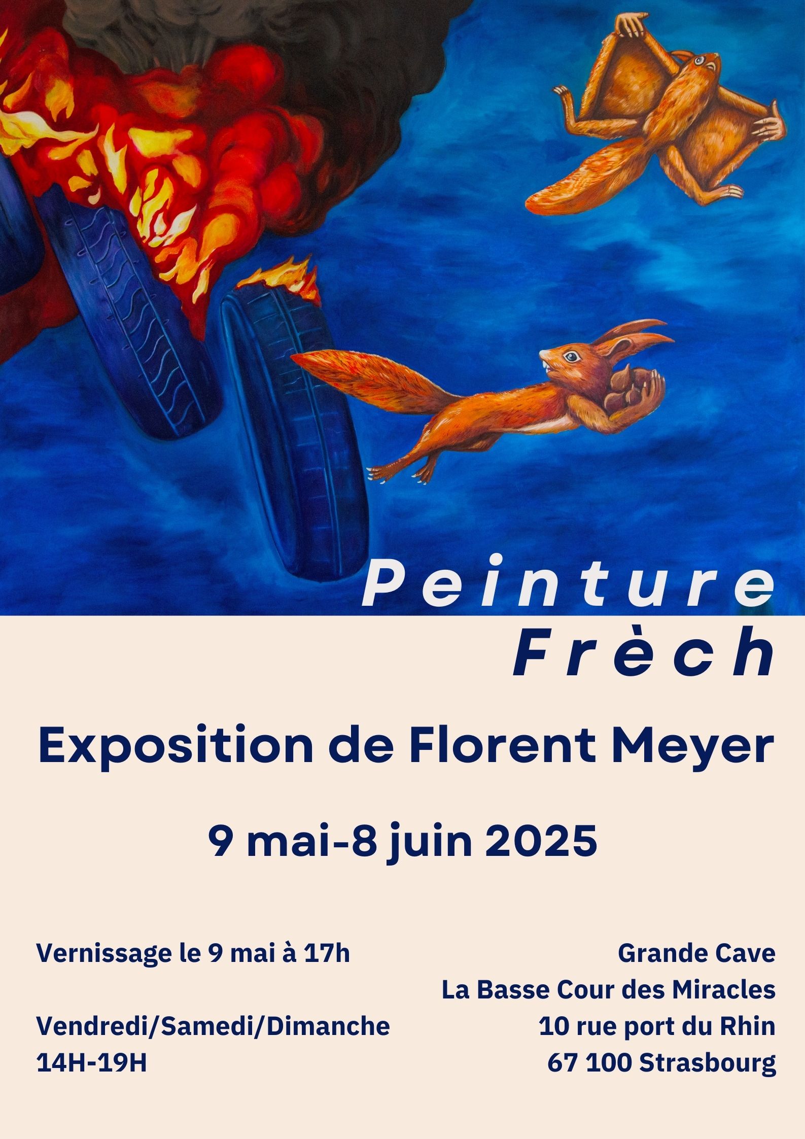 En bas-rhinois, le terme “Frèch” signifie effronté ou insolent, et se voit comme un clin d’œil à la culture de la satire rhénane. Ainsi, l’artiste présente des fables incisives pour évoquer notre addiction aux écrans, à la surconsommation jusqu’à la crise financière. D’autres grands formats de peintures à l’huile traitent avec onirisme de notre rapport aux artefacts dans un monde perturbé, grâce à des vanités encadrées par le renouveau d’une végétation luxuriante.