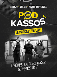 Podkassos c’est Franjo, Urbain, et Pierre Thevenoux, des humoristes qui se connaissent depuis quasi 10 ans et qui ont trouvé un prétexte pour traîner ensemble (enfin Franjo fait surtout ça pour l’arge Si tu es déjà un membre du pokassos gang tu sais très bien ce qui va se passer. En gros on va parler de sujets trop sérieux pour nous et donner des solutions pas ouf pour les gérer, parler mal de nos physiques respectifs, demander à Urbain de parler moins et à Franjo combien il gagne vraiment d’argent ? On change pas une formule qui gagne. On fera bien sur participer le public pour que vous trouviez des sujets pertinents et ce sera l’occase de vous croiser vous, nos auditeurs, pour la première fois. On a hâte ! Prends les billets ça va partir vite ! (ceci est une technique marketing)