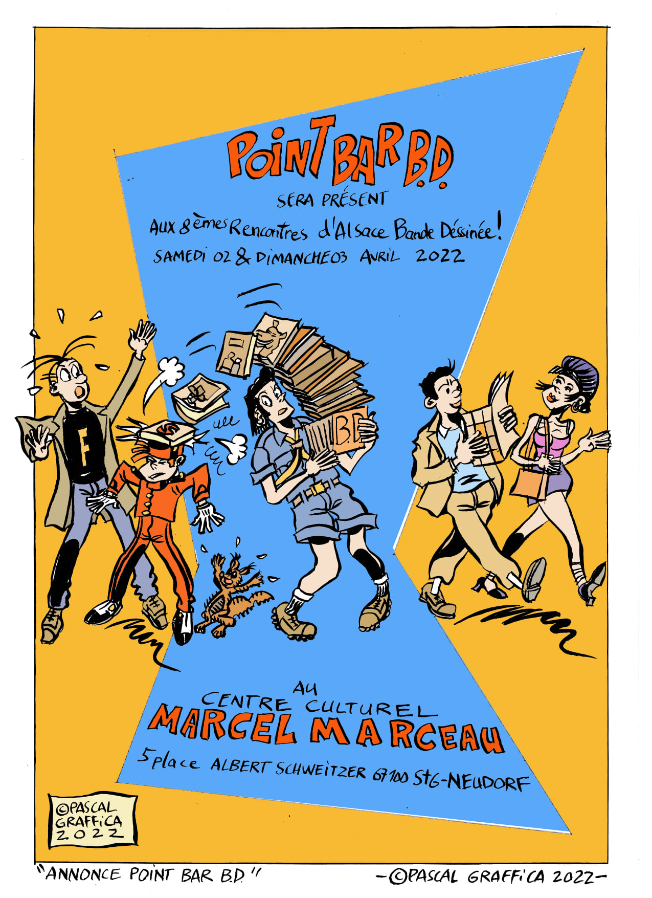 Tous les jeudis, de 19h30 à 22h00, l'équipe de Point Bar BD se réunit au Marché Bar pour trouver les thèmes des numéros, choisir le contenu, discuter BD, éventuellement vendre et dédicacer le fanzine et les albums de ses auteurs présents.Le BBCCF! Le nouveau fanzine bd mensuel tout en couleur 8 pages de GRAFFICA ! Le premier numéro est gratuit sur demande à la même adresse que POINT BAR BD.Le cro-Bar qui fait un duel avec lui-même, vu que c'est à la fois le dernier de 2021 et le premier de 2022 ; mais toujours au saloon le Marché Bar, un jeudi soir au coucher du soleil.A la salle MARCEL MARCEAU au Neudorf le 02 et 03 AVRIL !
