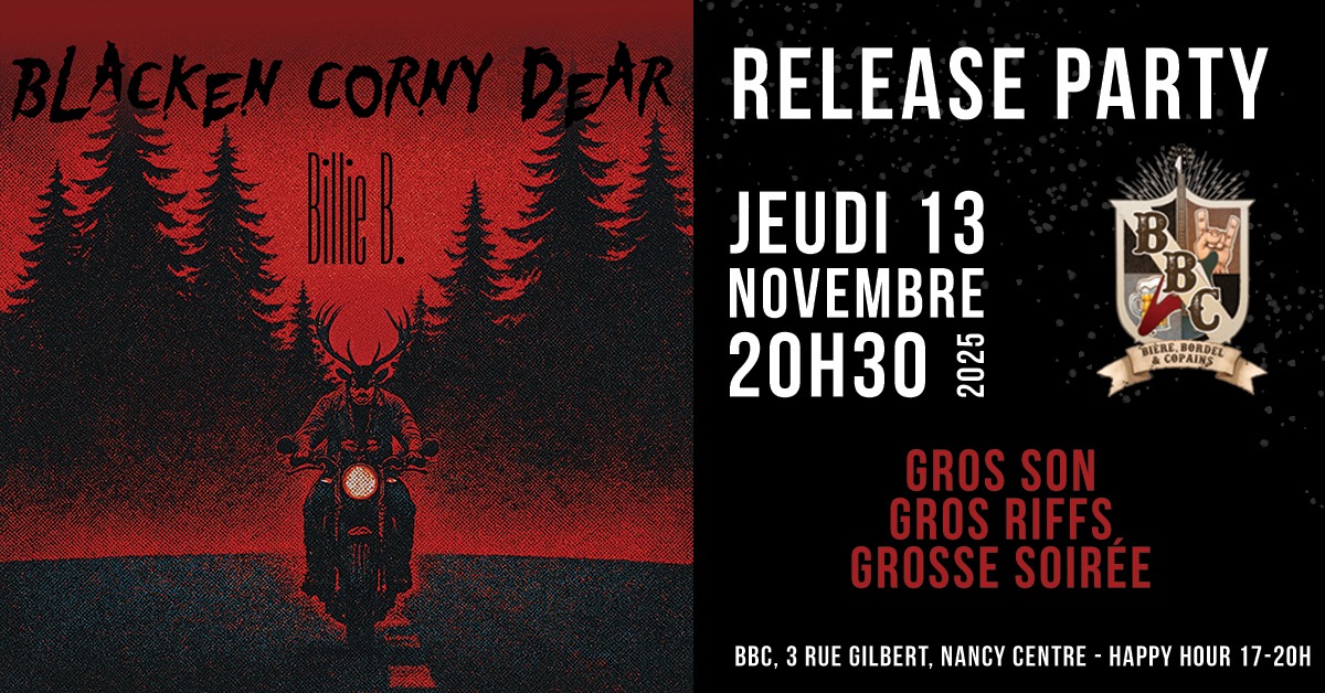 Jeudi 13 novembre à 20h30, le BBC accueille la release party du premier album de Billie B., Blacken Corny Dear. Une soirée rouge sang, pleine de riffs, de bruit, de fureur et de plaisir.