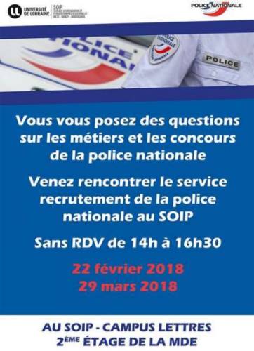 Le 29 mars de 14h à 16h30 : dernière date pour venir vous renseigner sur les métiers et les concours de la police nationale auprès du SOIP (Service d’Orientation et de l’Insertion Professionnelle), sur le campus Lettres et Sciences Humaines (au deuxième étage de la Maison de l’Étudiant, sans rendez-vous).