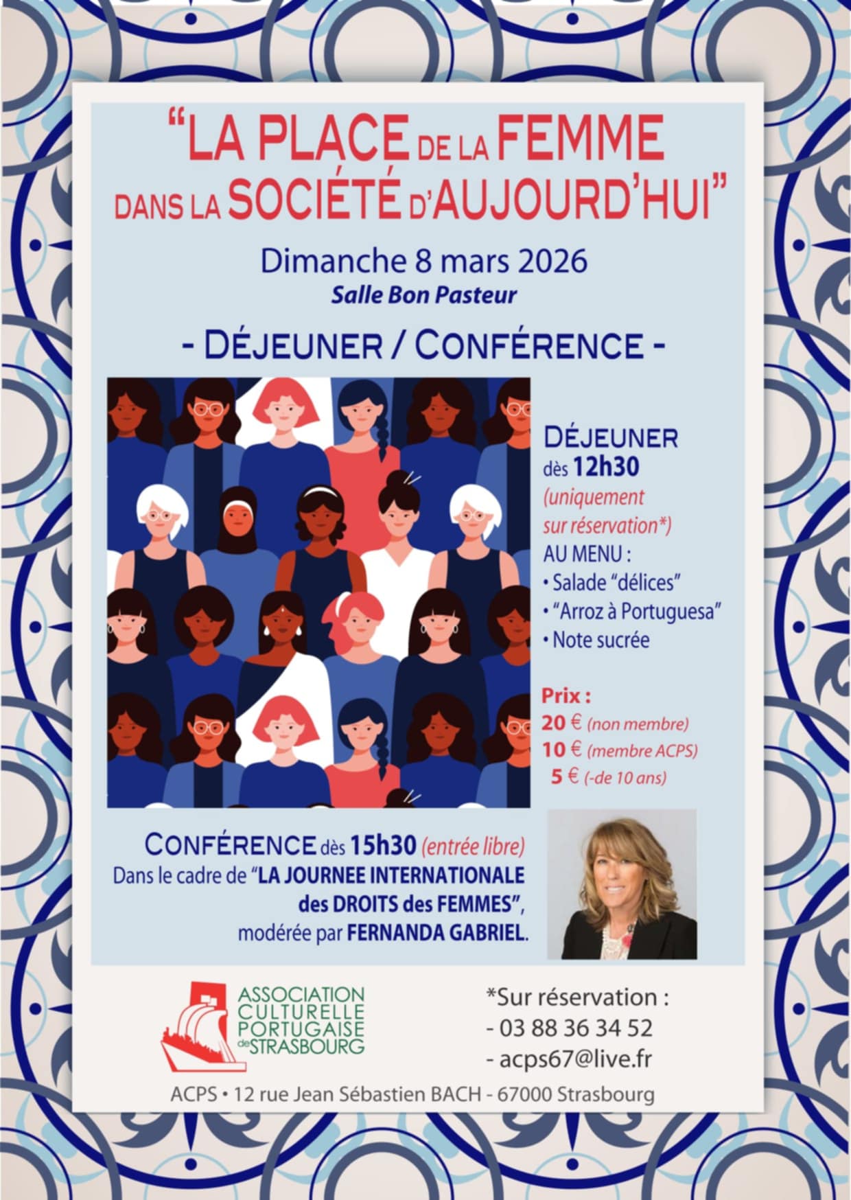 L'association culturelle portugaise de Strasbourg vous propose de se retrouver autour d'un déjeuner suivi d'une conférence dimanche 8 mars 2026 à partir de 12h30 à la salle Bon Pasteur, 12 boulevard Jean Sébastien Bach à Strasbourg.