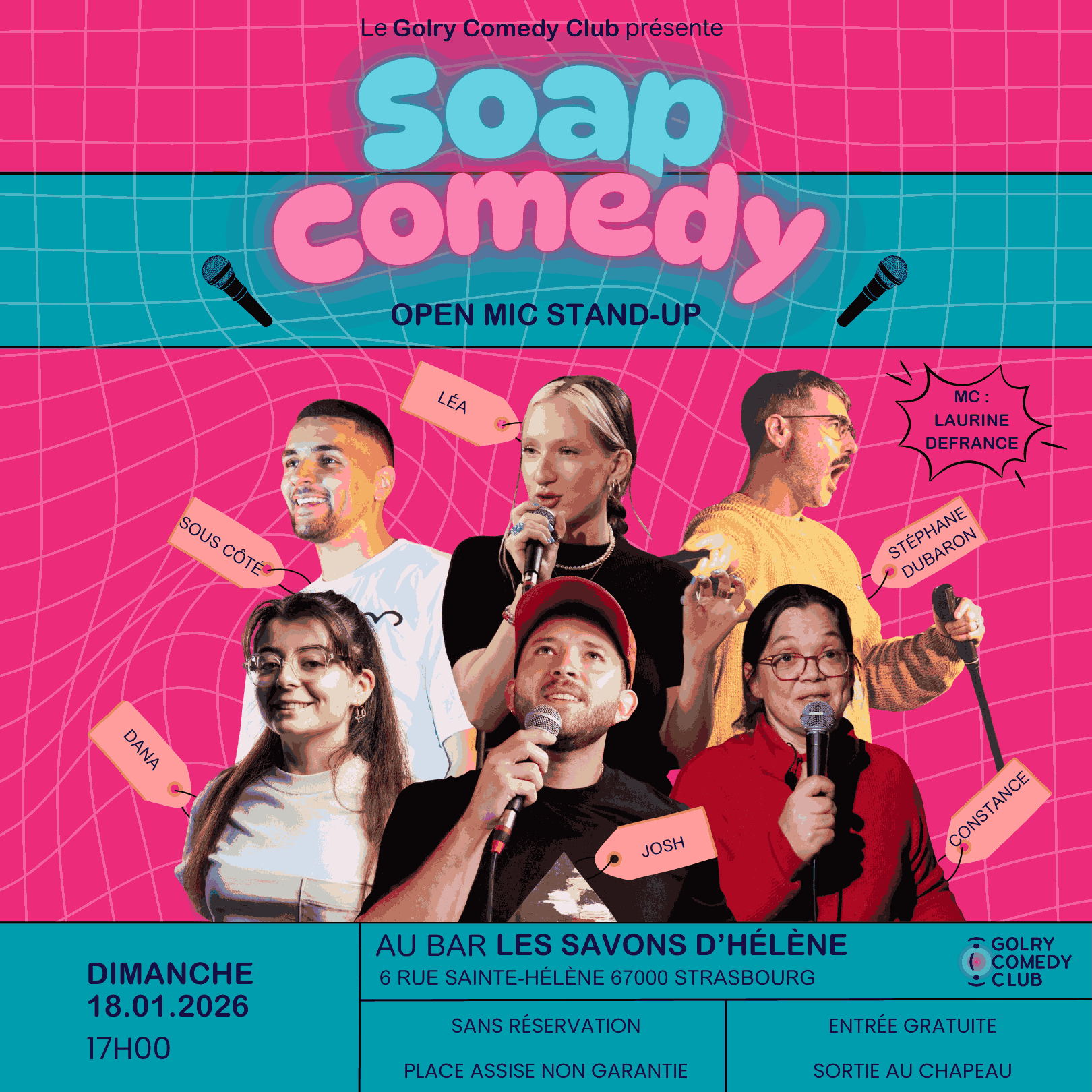 Le Soap Comedy, c'est l'open mic de stand-up du Golry Comedy Club et des Savons d'Hélène, un rendez-vous stand up dominical qui dure depuis plus de 3 ans !
