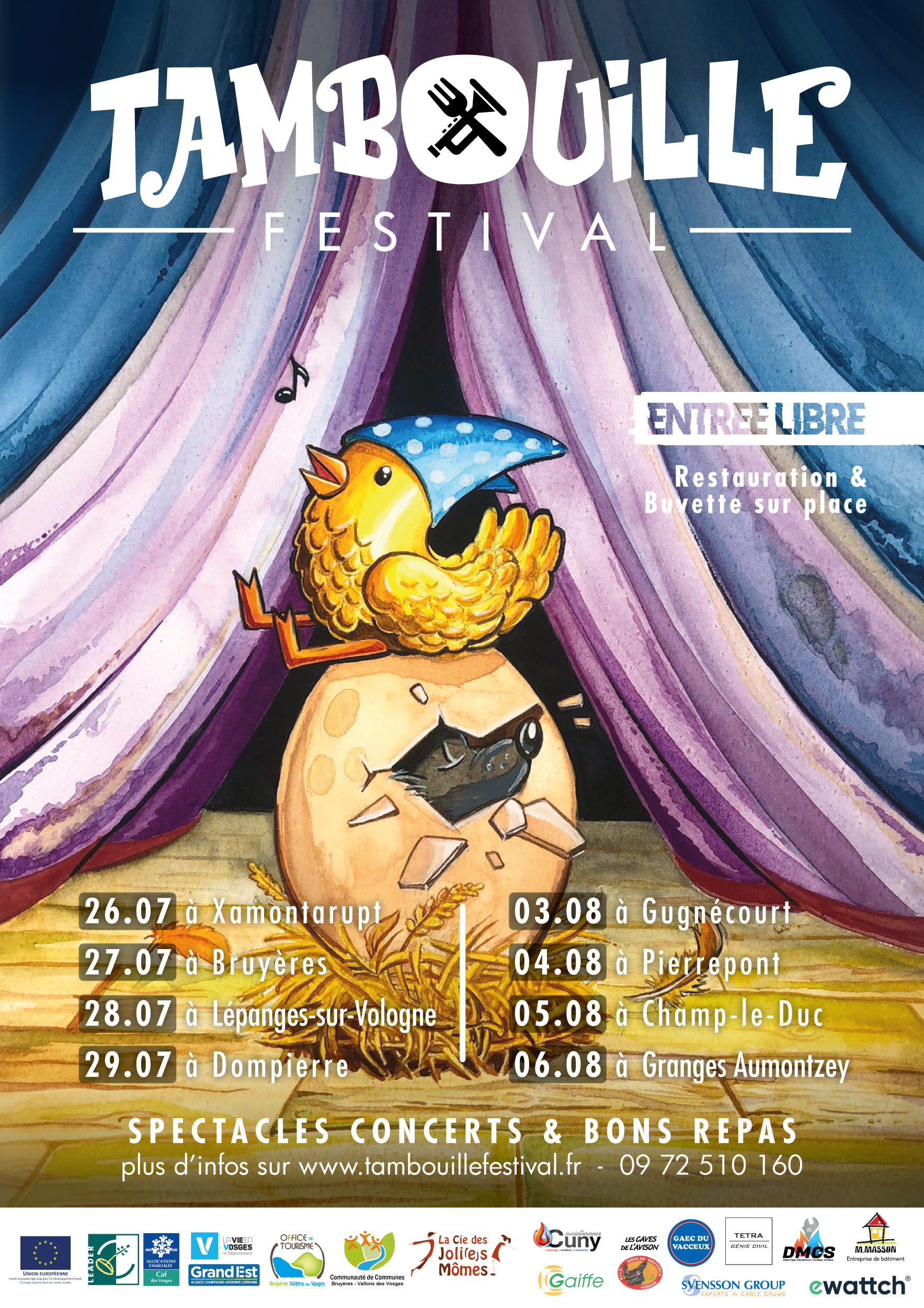 Le Tambouille Festival vous sort le grand jeu ! 8 jours de fête, dans 8 villages différents, 24 concerts, 9 spectacles, une soirée métal, une soirée électro, … Le tout les pieds dans l’herbe ! Bienvenue dans le plus grand des petits festivals vosgiens !