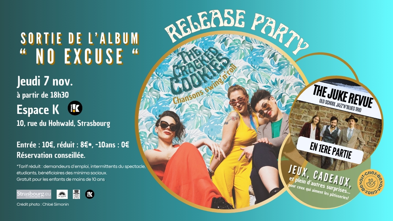 Venez découvrir le nouvel album du trio The Cracked Cookies : "NO EXCUSE". C'est de retour à Strasbourg, ville qui a vu naître le trio, que les trois chanteuses et multi-instrumentistes vont présenter leurs nouvelles compositions, allant du rock' prog' à la drôlerie cabaretique. Le trio masculin The Juke Revue ravira vos oreilles en première partie avec leur univers "old school jazz'n'blues" dansant et plein de bonne humeur. Des surprises vous attendent, venez avec vos enfants, y en aura pour tous les goûts!