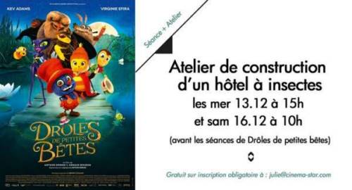 Les ateliers de construction d’un hôtel à insectes pour la rue du jeu des enfants auront lieu le mercredi 13 décembre à 15h et le samedi 16 décembre à 10h avant la séance de Drôles de petites bêtes. Ces ateliers sont gratuits et s’adresse aux 3-8 ans et à leurs parents. Rendez-vous au cinéma Star.