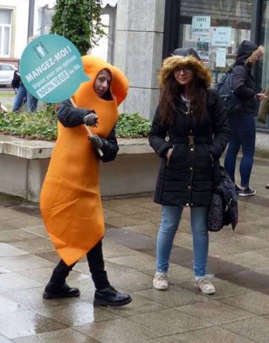 Des légumes géants portant des pancartes Mangez-moi ! Signez pour des options 100% végé au RU. inviteront les étudiants à signer des cartes pétitions qui seront remises par Animalsace aux responsables au fur et à mesure de nos actions.