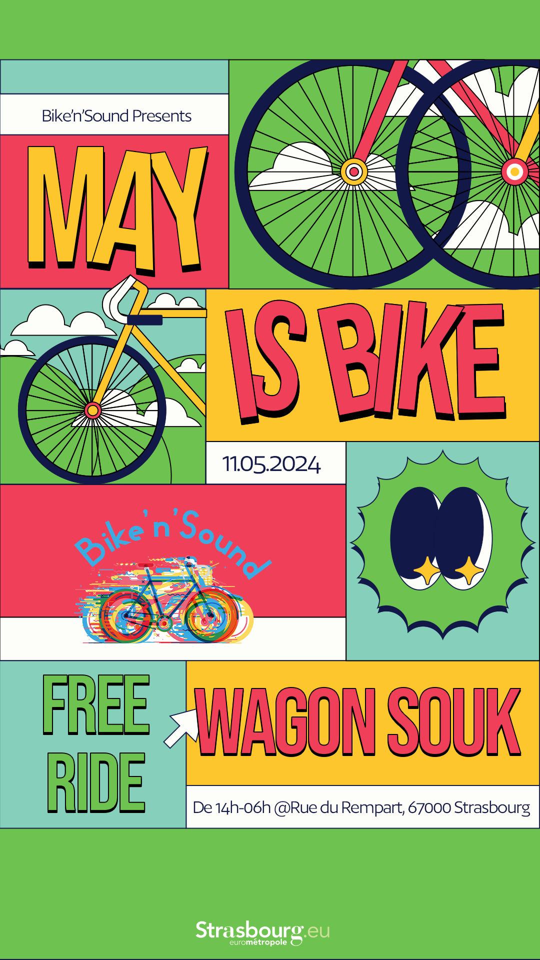 Bike'n'Sound organise une parade à vélo le Samedi 11 mai 2024 dans toute la Ville de Strasbourg, au rythme des musiques électroniques. Une performance collaborative ! Vous êtes invités à apporter vos lumières, déguisement et accessoires les plus loufoques afin de créer une ambiance festive et décalée. Bike'n'Sound vous propose de se retrouver pour un moment de partage autour du son, de la fête et du vélo tout en faisant un peu de sport !