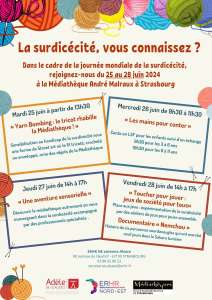 Venez vivre une expérience immersive et découvrez la médiathèque sous un autre angle. Accompagnés par des experts en surdicécité, les participants seront invités à explorer l’espace de manière sensorielle, afin de mieux comprendre les défis quotidiens des personnes sourdes et aveugles.