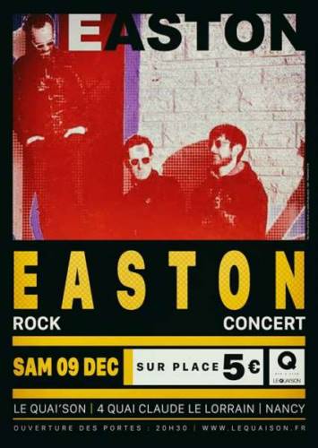EASTON est un groupe de rock Nancéen formé par trois copains qui ont fait leurs gammes pendant 23 ans en s’amusant. Leur première rencontre se passe sur les bancs de la fac. Depuis, ils níont cessé de jouer ensemble.