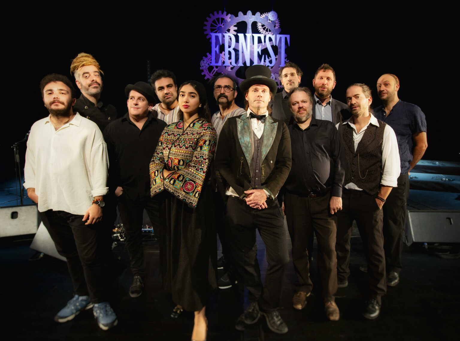 Ernest revient avec une création inédite, entouré d’invités virtuoses en provenance de plusieurs ici et de nombreux ailleurs. Ensemble, ils présenteront un tout nouveau répertoire surprenant et envoûtant, tissé de mélodies des pays des Mille et Une Nuits, de phrases du Caucase et d’anatoles d’Anatolie. Accompagnée d’une vingtaine d’instruments venus des quatre vents (et cordes et percussions…), s’étant accordés à l’unisson avec l’ambition de faire de la chanson la plus belle des tours de Babel, une équipe cosmopolite vous invite à contempler des paysages musicaux et poétiques encore inexplorés.