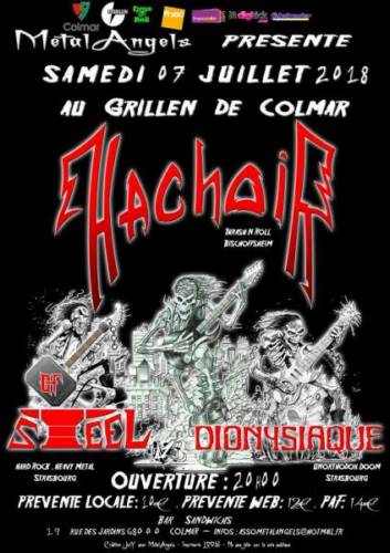 « Quatuor de Thrash n’ Roll originaire des contrées Alsaciennes, sévit sur scène depuis 1998 armé de riffs affûtés et de textes incisifs hurlés dans la langue de Molière. Inspiré par des groupes tels MEGADETH, IRON MAIDEN, SLAYER et MOTÖRHEAD, HACHOIR a notamment ouvert pour KILLERS, TANKARD ou encore DESTRUCTION et se forge désormais une playlist en acier trempé pour continuer à faire vibrer vos tympans ! »