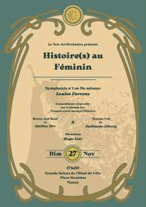 Le New Art' Orchestra, jeune orchestre nancéien, concrétise son premier projet intitulé "Histoire(s) au féminin", le dimanche 27 novembre 2022 à 17h dans les Grands Salons de l'Hôtel de ville de Nancy. Ce concert a pour ambition de mettre en avant les femmes à travers la musique tant par le travail de compositrices que par des portraits musicaux de femmes ayant marqué leur époque.