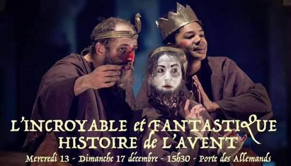 L’HISTOIRE : Trois moines, plus clowns qu’hommes d’Eglise, partent à la rencontre des badauds pour leur conter la naissance du Sauveur et communier en rires salutaires à grandes poignées de papillotes. Très exactement basée sur les évangiles de Mathieu et Luc - à quelques écarts près - L’Incroyable et Fantastique Histoire de l’Avent invite les croyants comme les athées à se retrouver autour d’un moment chaleureux en musique, avec comme chaque année l’excuse de la tradition.