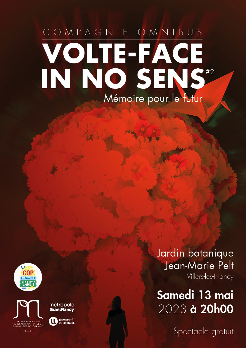 Volte-Face In No Sens #2 - Mémoire pour le futur propose une expérience immersive et sensorielle pour aborder la question urgente de la préservation du vivant. Trois artistes au plateau : une comédienne, voix principale pour le récit poétique, un musicien à la voix et à la guitare et une joueuse de taiko japonais à la voix et à la percussion. Seule source de lumière du spectacle : des vidéo-projections qui vont se développer aussi sur la végétation environnante du jardin botanique. Pour emporter les spectateur.rice.s dans un monde de sensations fortes, le vidéaste puise dans l’organique (eau, feu, ciel, végétal, minéral) en insérant les corps des artistes et l’espace scénique dans une matière fluide et colorée. L’ensemble plonge le public dans un univers onirique et met en mouvement les imaginaires vers un futur désirable.