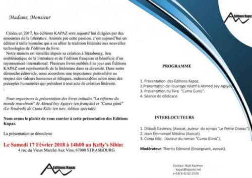 Nous organisons la présentation des livres intitulés La réforme du monde musulman de Ahmed bey Agayev (en français) et Cuma günü (Le Vendredi) de Cuma Kilic (en turc, édition spéciale).