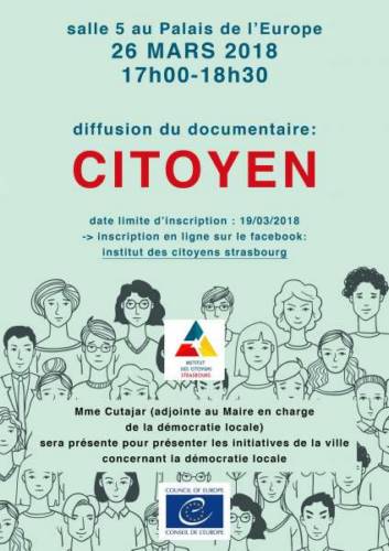Le 26 Mars au Conseil de l’Europe il y aura une projection du documentaire ’Citoyen’ qui présente la crise démocratique en France depuis le regard des citoyens, experts et ceux qui cherchent actuellement des solutions/alternatifs.