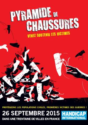 Handicap International organise chaque année depuis 20 ans la Pyramide de chaussures dans plusieurs villes françaises pour mobiliser les citoyens contre les mines et les bombes à sous-munitions, et contre l’utilisation des armes explosives en zones peuplées. Prochaine édition le samedi 26 septembre 2015 : rejoignez le combat !