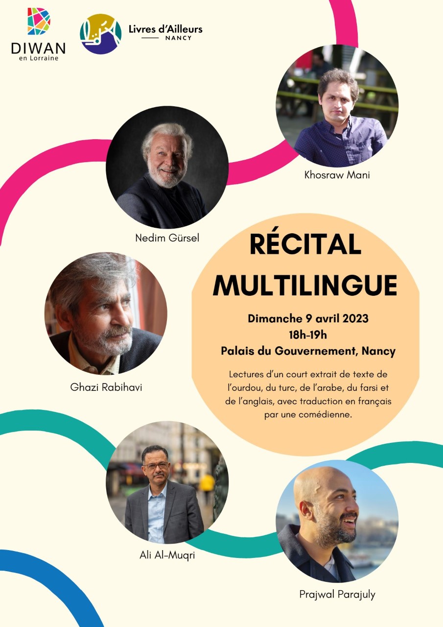 Pour clore le salon Livres d'Ailleurs, lectures de courts extraits de textes de l’ourdou, du turc, de l’arabe, du farsi et de l’anglais par les auteurs Khosraw Mani, Nedim Gürsel, Ali Al-Muqri, Ghazi Rabihavi, Prajwal Parajuly et de leur traduction en français par la comédienne Françoise Klein.