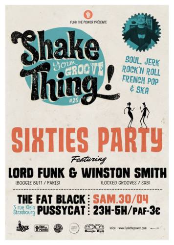 Une fois n’est pas coutume, le thème de cette Shake vingt-cinquième du nom sera "les sixties", qu’elles soient U.S, Latin, Brittish ou françaises. Et pour l’occasion c’est Lord Funk qui signe son retour sur les platines du Fat, accompagné de ses innombrables et incomparables "digs" d’époque!! Ça va twister, jerker, rock’n roller, mais sauter et transpirer sur des sons soul, popcorn, rhythm’n blues ou ska. En gros on vous promet un tour d’horizon endiablé des sons qui ont fait de cette époque un moment incontournable en terme de groove et de créativité!